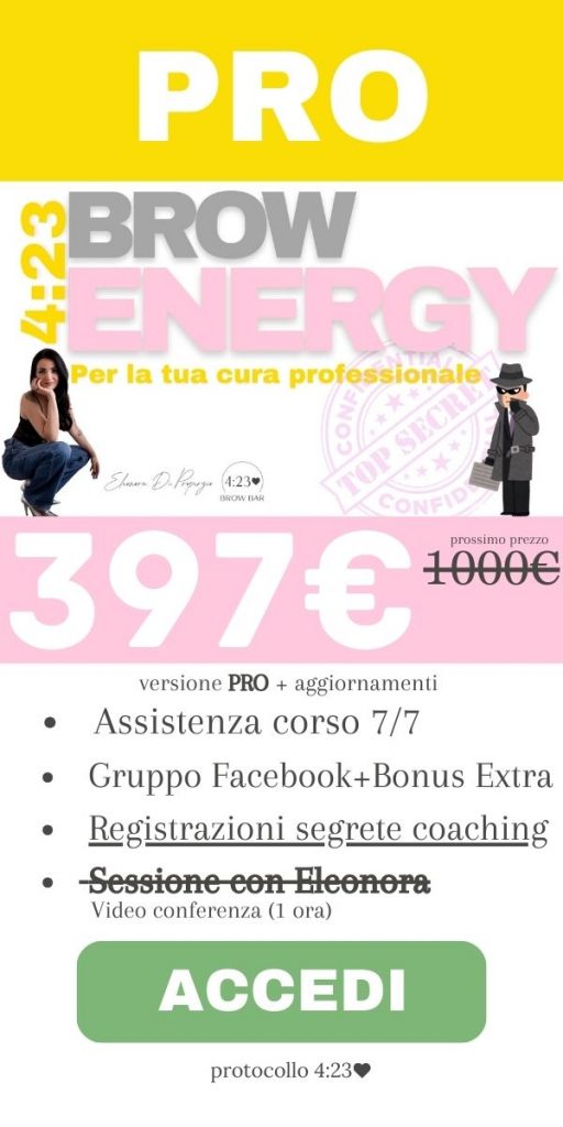 DISCLAIMER: Nella natura della trasparenza e dell’autenticità del sito, all’interno trovi contenuti di formazione altissimo profilo, tuttavia ognuno segue, pratica ed applica tali informazioni come meglio crede. Quindi, Eleonora Di Properzio e il Brow Bar 4:23 si solleva da qualsiasi responsabilità per applicazione senza una diretta supervisione.