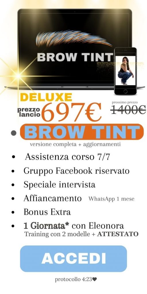 Con BROW TINT, Eleonora condivide il suo vasto bagaglio di conoscenze, offrendo una formazione completa che va oltre l’estetica delle sopracciglia, abbracciando la cura globale del viso. Il programma è progettato per trasmetterti la migliore metodologia di trattamento al mondo, da applicare con successo sulla tua clientela. È pensato per fornire tutti gli strumenti necessari per intraprendere una carriera di successo come professionista dello sguardo, garantendo a te e alle tue clienti, un’esperienza straordinaria.